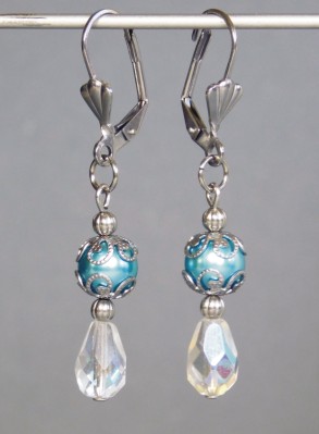 Bižutéria - Náušnice chirurgická oceľ, plast, sklo, dl. 5cm, tyrkyso